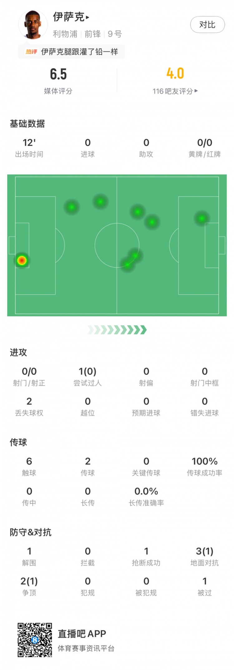伊萨克数据:替补登场0射门,6触球2传球2次赢得对抗,评分6.5